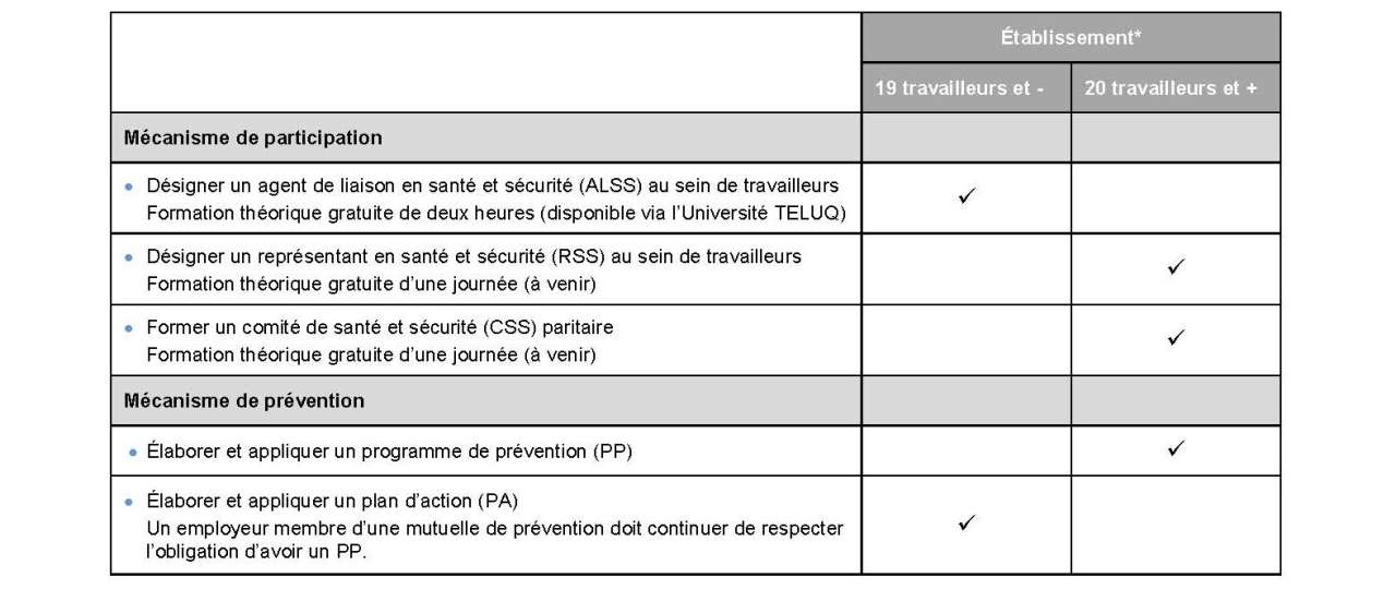 Selon le nombre de travailleurs dans l’établissement, l’employeur doit obligatoirement appliquer des mécanismes de prévention et de participation. Les établissements comptant 19 travailleurs et moins au cours d'une année n'ont pas les mêmes obligations que les établissements comptant 20 travailleurs et plus. Le nouveau Règlement sur les mécanismes de prévention et de participation en établissement (RMPPÉ) précise certaines modalités d’application.